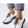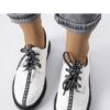Białe półbuty Hanifan to idealny wybór dla wszystkich miłośników modnych i wygodnych butów. Mają one kontrastową, traktorową podeszwę z kwadratowym, płaskim obcasem, co nadaje im wyjątkowego charakteru. Niska cholewka sięga przed kostkę, a krótkie sznurowanie na przodzie dodaje im dodatkowego uroku. Okrągły nosek i minimalistyczne przeszycia sprawiają, że buty te pasują do wielu stylizacji.