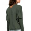 Bluza damska o luźnym kroju z rękawami zakończonymi długim ściągaczem, pod szyją drapowany dekolt i lekko wycięty dekolt z tyłu. Swoboda i modny styl.
