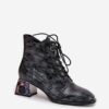 Botki damskie marki Artiker wykonane z lakierowanej skóry naturalnej to eleganckie obuwie z nutą oryginalności. Osadzone na stabilnym obcasie typu klocek, ozdobionym kryształkami, przyciągają uwagę i dodają stylizacjom wyjątkowego charakteru. Model łączy sznurowanie z praktycznym zamkiem, co ułatwia zakładanie i dopasowanie do stopy. Zaokrąglone noski podkreślają klasyczny fason, a wnętrze ocieplone miękkim w dotyku kocem obuwniczym zapewnia komfort i ciepło w chłodniejsze dni.