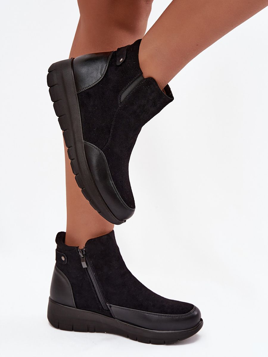 Botki damskie wykonane z połączenia eko zamszu i eko skóry. Model został osadzony na platformie, co zapewnia wygodę i stabilność podczas chodzenia. Wnętrze wykończono grubym futerkiem, które skutecznie chroni przed zimnem i gwarantuje komfort w mroźne dni. Zaokrąglone noski nadają całości klasycznego wyglądu, a praktyczne zapięcie na zamek ułatwia zakładanie i zdejmowanie. To botki, które świetnie sprawdzą się w codziennym użytkowaniu, oferując jednocześnie ciepło, wygodę i modny styl w sezonie jesienno-zimowym.