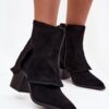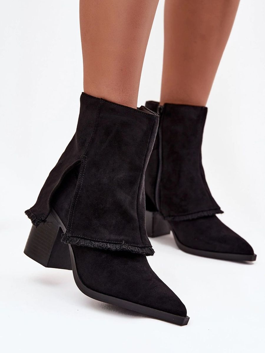 Botki damskie wykonane z eko zamszu. Model osadzony został na stabilnym obcasie typu słupek, który pięknie wysmukla sylwetkę i dodaje kilku centymetrów wzrostu, zachowując przy tym komfort noszenia. Charakterystycznym elementem jest wywinięta cholewka nachodząca na obcas, co nadaje wyjątkowego wyglądu i sprawia, że wyróżniają się na tle klasycznych fasonów. Szpiczaste noski dodatkowo podkreślają smukłą linię obuwia. Praktyczne zapięcie na zamek ułatwia zakładanie i zdejmowanie. To botki idealne dla kobiet, które szukają stylowego uzupełnienia jesienno-zimowych stylizacji zarówno tych codziennych, jak i bardziej wyjściowych.