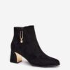 Botki damskie wykonane z eko zamszu to elegancka propozycja dla kobiet ceniących modny wygląd i wygodę. Osadzone na stabilnym obcasie typu słupek pięknie wysmuklają sylwetkę, a noski w kształcie migdała dodają subtelnej elegancji. Model zapinany na zamek ułatwia zakładanie i zdejmowanie. Stylowego charakteru nadają złote detale umieszczone na obcasie i cholewce, które przyciągają wzrok i podkreślają nowoczesny design. To buty idealne zarówno na co dzień, jak i na bardziej eleganckie okazje.