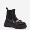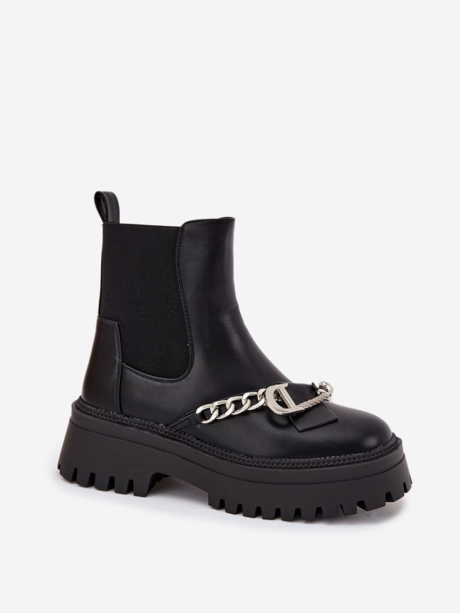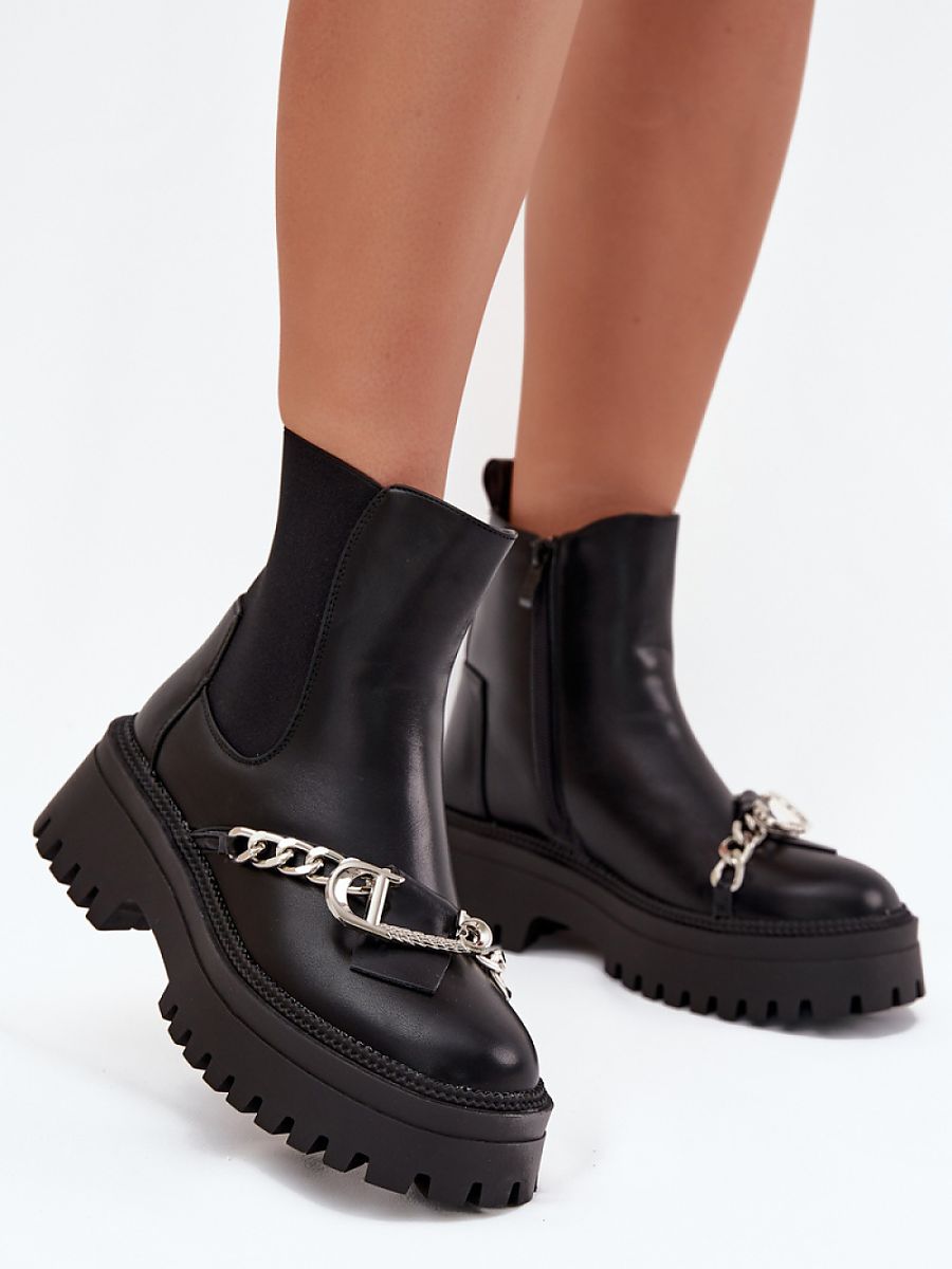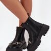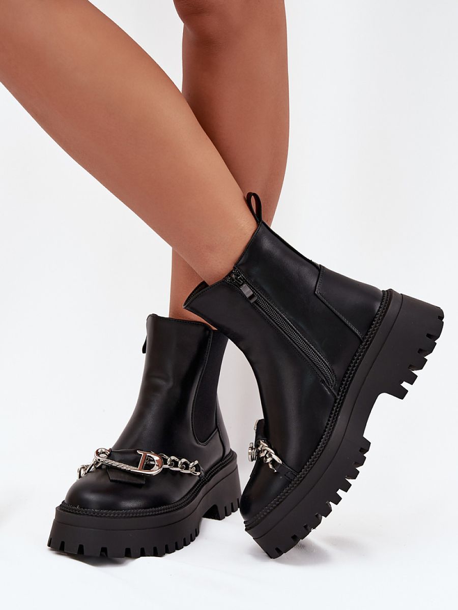 Botki damskie z eko skóry to stylowa i komfortowa propozycja na chłodniejsze dni. Osadzone na platformie, zapewniają wygodę i stabilność, a zaokrąglone noski dodają im subtelnego charakteru. Środek ocieplony futerkiem gwarantuje ciepło, a ozdobny łańcuch oraz ozdoba w formie agrafki na cholewce nadają im wyjątkowego wyglądu. Elastyczna wstawka z boku cholewki ułatwia zakładanie, a zamek błyskawiczny zapewnia wygodne dopasowanie. Idealne na co dzień.