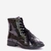 Lakierowane botki wykonane z eko skóry to modny i elegancki wybór na chłodniejsze dni. Model osadzony na płaskim obcasie, zapewnia wygodę noszenia, a ocieplenie gwarantuje ciepło. Zapięcie na zamek ułatwia zakładanie, natomiast ozdoba na sznurowaniu dodaje wyjątkowego uroku. Idealne do codziennych oraz bardziej eleganckich stylizacji.