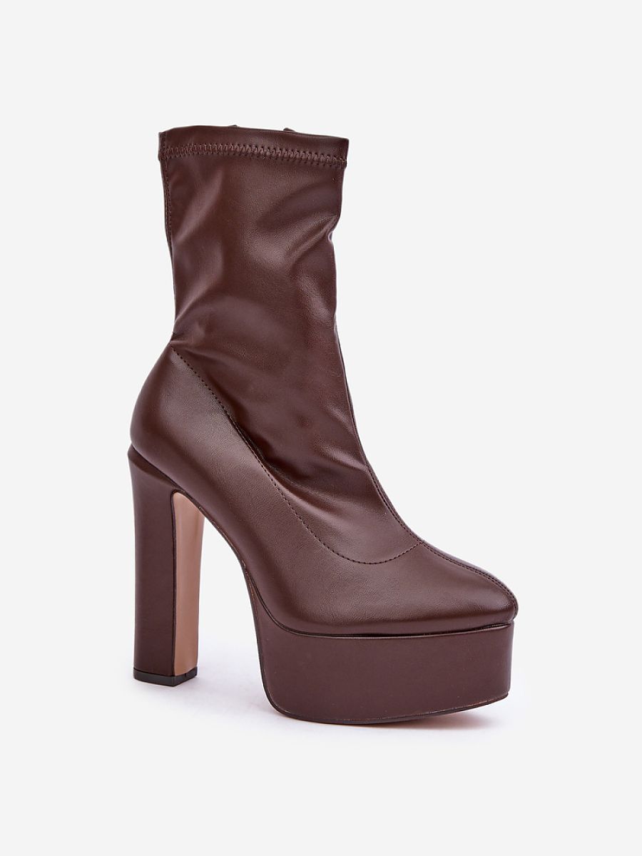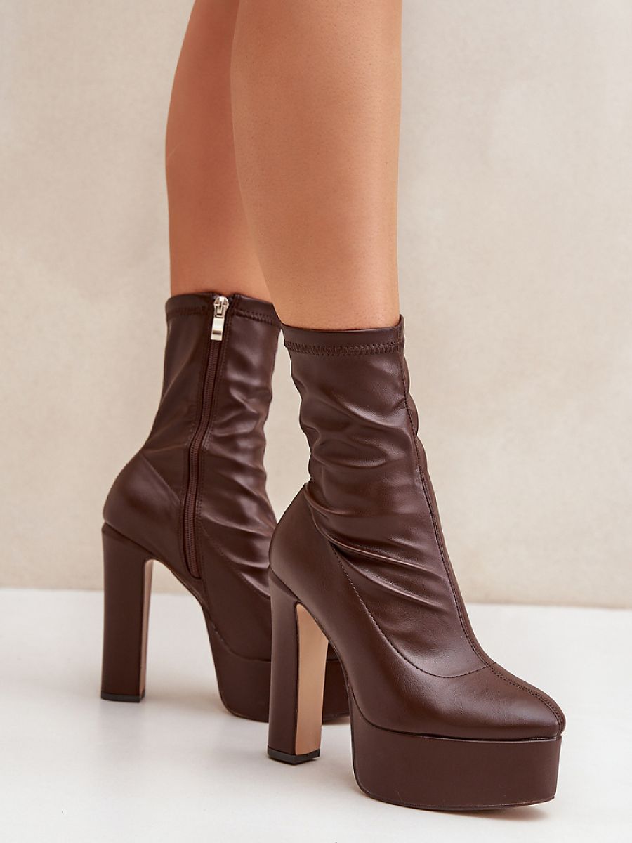Botki damskie wykonane z ekologicznej skóry. Model ten wyróżnia masywna platforma i wysoki obcas typu słupek. Zapinane na zamek. Środek ocieplany wyłącznie na wysokości stopy. Noski w migdał. Stylowe i kobiece, świetne na różne okazje!