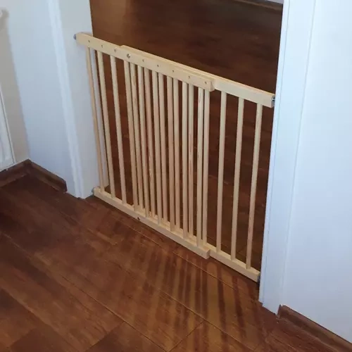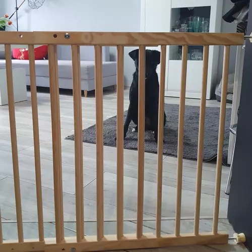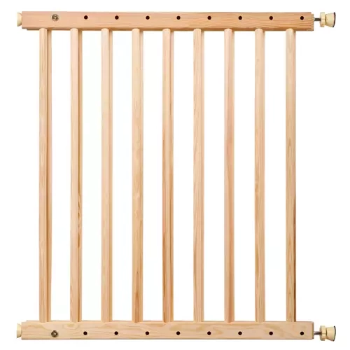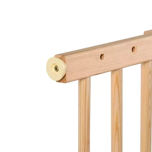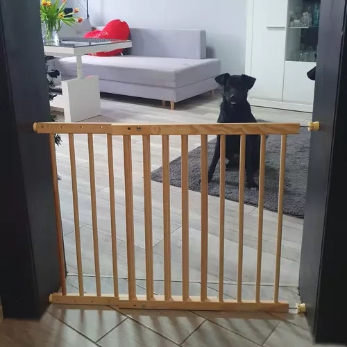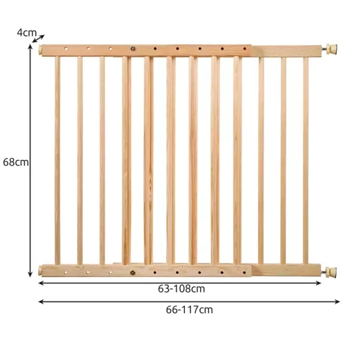 • SPECYFIKACJA – materiał: drewno – sosna; bramka pasuje do przejść o szerokości: 66-117 cm; wysokość bramki: 68 cm;  grubość szczebelka: 15,5 mm; waga bramki: 2,4 kg; waga z opakowaniem: 3,1 kg.