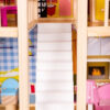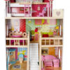 - PRZESTRONNY – drewniany domek dla lalek przeznaczony jest dla 4 osobowej rodziny lalek. Posiada 3 poziomy, które połączone są ze sobą pięknymi, białymi schodami, aż 5 pomieszczeń + balkon i ogród z basenem. Każda lala marzy o takim dużym domku!