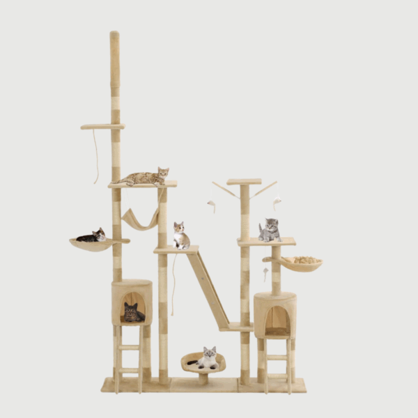 Ta kocia forteca to raj na ziemi! Twoje kociaki mogą ostrzyć pazury na solidnych sizalowych słupkach – żegnajcie zniszczone meble! Poza tym, mogą urządzać dzikie gonitwy, skacząc w górę i w dół jak małe ninja. A gdy zmęczą się tymi akrobacjami, czeka na nie mnóstwo wygodnych miejsc do relaksu.