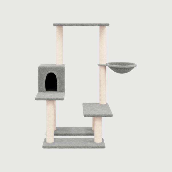 Nasz drapak ma wszystko, czego kot może sobie zażyczyć: domek do knucia tajnych planów, hamak do leniuchowania i platformy, z których będzie mógł obserwować swoje królestwo.