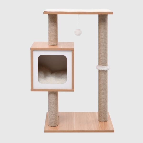 - Wyposażenie: domek, wisząca piłka, jutowe słupki do drapania, platformy i miejsca do relaksu
