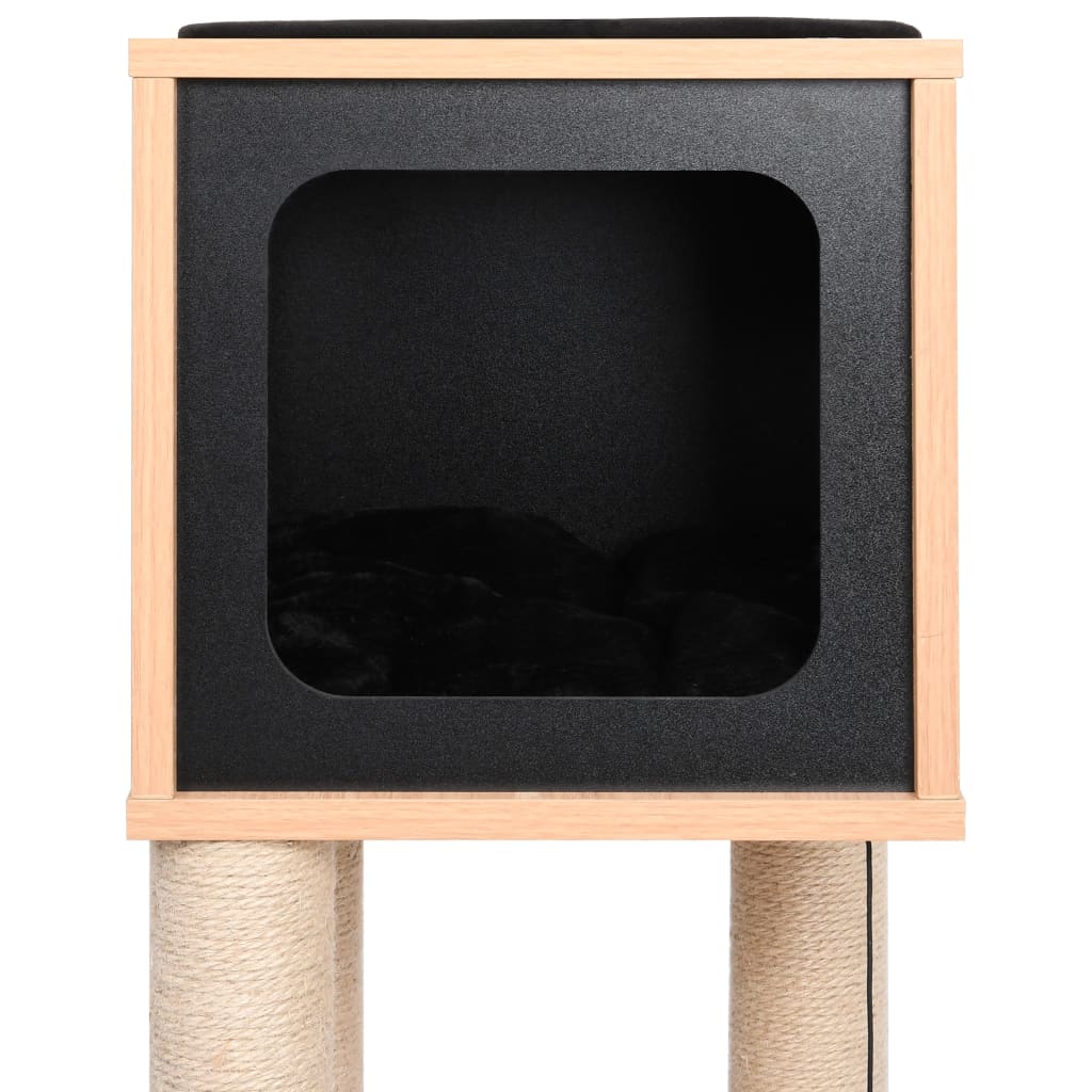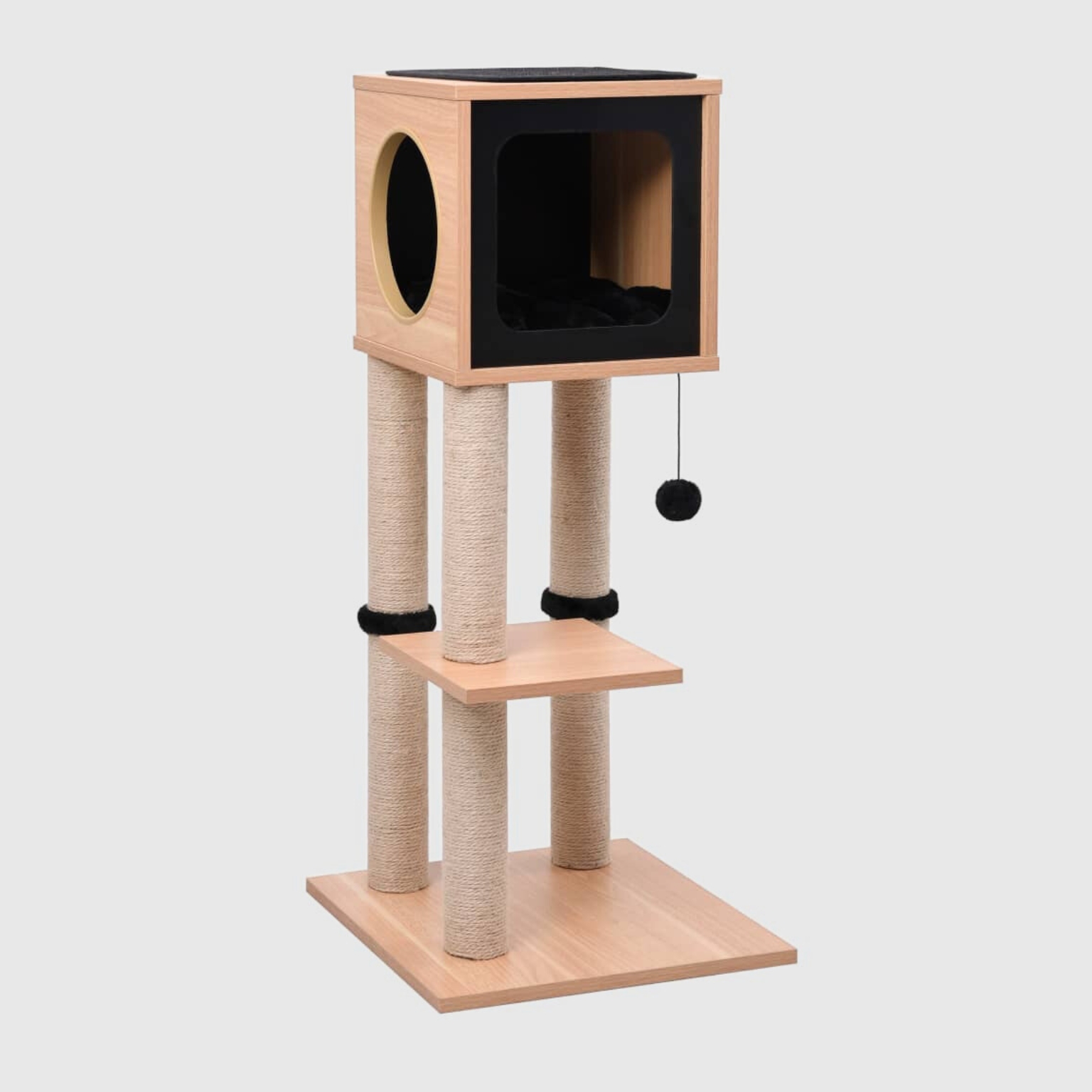 - Wyposażenie: domek, wisząca piłka, jutowe słupki do drapania, platformy, miejsca do relaksu