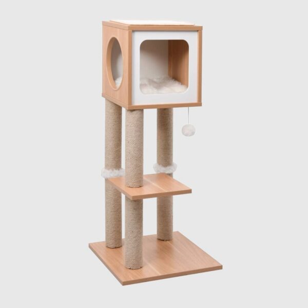 - Wyposażenie: domek, wisząca piłka, jutowe słupki do drapania, platformy, miejsca do relaksu