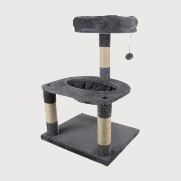 Nasz szary drapak dla kota ochroni Twoje meble i zapewni Twojemu kotu miejsce do zabawy, aktywności i wypoczynku. Dzięki różnorodnym elementom do zabawy, takim jak platforma, zawieszka, słupki i legowisko, nasz drapak stanie się ulubionym miejscem Twojego mruczka. Zaprojektowany z myślą o potrzebach kociego towarzysza, drapak oferuje komfortowe legowisko na każdym poziomie, wyłożone miękkim futerkiem. Gwarantuje to przyjemne wypoczywanie z delikatnym pomrukiem w tle. Trzy poziomy do obserwacji zaspokajają ciekawość kota, a zamontowana miękka piłka na gumce zachęca do zabawy.