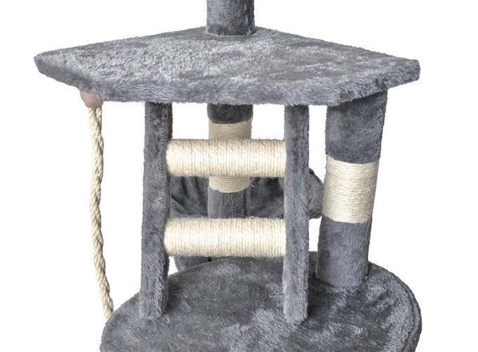 - DRAPAK Z 4 POZIOMAMI – drapak w formie drzewka ma aż 118 cm wysokości, podzielony został na 4 pięter, przez które kot może się swobodnie przemieszczać i leniuchować, ale również czaić się i bawić z innymi kotami. Solidna konstrukcja z szeroką podstawą zapewnia stabilność drapaka. Główną zaletą drzewka jest przytulny domek na którym umieszczone są dwustopniowe schodki. Kociak będzie mógł swobodnie odpocząć. Na drzewku umieszczono puchatą myszkę, które pobudzają kocią ciekawość i zachęcają kota do zabawy czy polowania. Została zamontowana na lince na 4 piętrze drzewka.