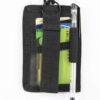 - TYLNA CZĘŚĆ – posiada trzy niezależne kieszonki na mniejsze dokumenty np. prawo jazdy, dowód osobisty czy kartę płatniczą. One również mają zabezpieczenie dzięki paskowi biegnącemu przez środek, zapinanemu na mocny rzep. Dzięki temu mamy pewność, że dokumenty nie wypadną. Pasek ten umożliwia także podczepienie etui do paska przy spodniach. Z tyłu znajduje się także kółko z zamocowanym sznurkiem, który pozwala zawiesić etui na szyi lub przymocowanie do torby oraz uchwyt na długopis.