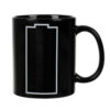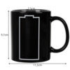 • WYSOKA JAKOŚĆ – ten elegancki czarny kubek, posiada optymalną pojemność 330 ml. Wykonany jest z ceramiki dopuszczonej do kontaktu z żywnością i napojami. Nie zawiera żadnych substancji szkodliwych, które mogłyby się przedostać do cieczy. Termoczuła farba, zmienia kolor na zielony podczas oddziaływania na nią gorącym napojem lub wodą. Ceramika z jakiej został wykonany kubek długo utrzymuje płyn w wysokiej temperaturze. Dzięki symbolowi baterii, można zaobserwować kiedy napój zaczyna się ochładzać. Wygodne, duże ucho zapewnia stabilny i mocny chwyt kubka.
