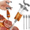- AŻ TRZY RÓŻNE IGŁY W ZESTAWIE – w komplecie znajduje się nie tylko strzykawka do szynki o pojemności 50 ml, ale również trzy igły. Każda z igieł jest inna, co zwiększa możliwości zastosowania strzykawki do mięs. Znaleźć można tu igłę z jednym otworem, dwoma otworami oraz pięcioma otworami.