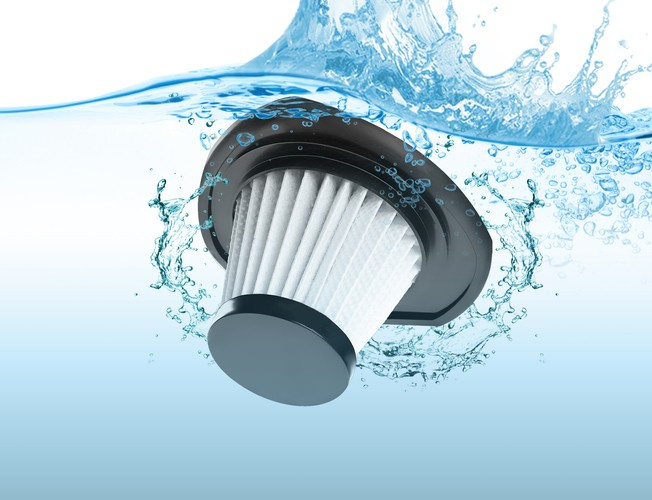 • PODWÓJNY SYSTEM FILTRACJI – filtr HEPA znajdujący się wewnątrz zapobiega wydmuchiwaniu najdrobniejszych pyłów na zewnątrz, dezynfekuje przechodzące przez niego powietrze, a dodatkowo chroni silnik urządzenia przed uszkodzeniem. Dzięki zastosowaniu filtra odkurzacz nie traci swojej mocy i cały czas jego siła ssania jest niezmienna. Można go bez problemu wyjąć i umyć pod bieżącą wodą.