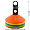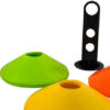 - SPECYFIKACJA – materiał: pachołki (PE), stojak (PP), worek (dominujący materiał: nylon, pozostałe: PP); kolory: czerwony, niebieski, pomarańczowy, zielony, żółty; wymiary zestawu: 20 x 24 cm; wymiary 1 pachołka: 20 x 4,5 cm; waga 1 pachołka: 19 g; waga zestawu 0,95 kg; waga zestawu z opakowaniem: 1,09 kg.