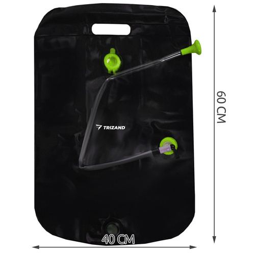 - SPECYFIKACJA – pojemność: 20 l; zalecany czas nagrzewania na słońcu: 3 h; wymiary: 60 x 40 cm; waga prysznica: 0,355 kg; waga prysznica z opakowaniem: 0,428 kg.