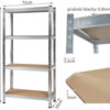 - SPECYFIKACJA – wymiary regału (wys/szer/głęb): 150/75/30cm; wymiary półki (szer/dł): 74,3/29,3cm; max. obciążenie na półkę: 135kg (razem 540kg na cały regał); ilość półek: 4; materiały: stal ocynkowana 0.8mm, płyta MDF 4mm; montaż: bezśrubowy (poprzeczki wciskane); waga: ~11kg.