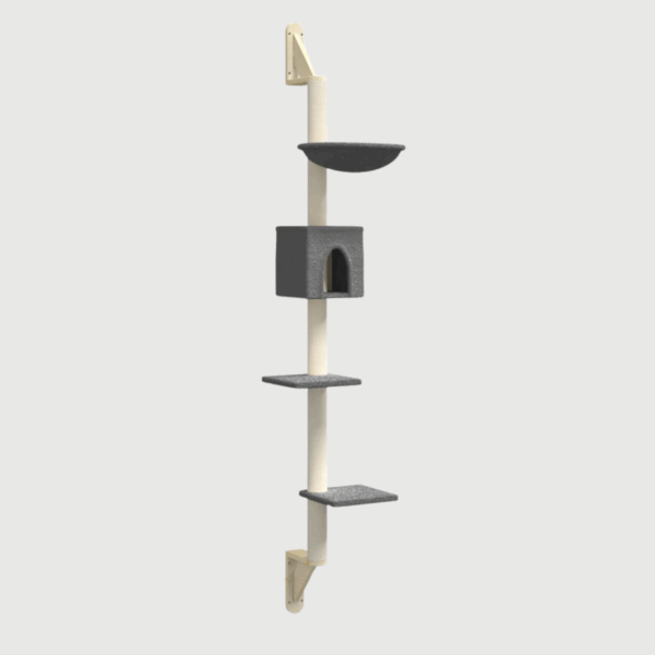 Zamień swoją ścianę w koci portal do świata niekończących się przygód! Nasze drzewko do montażu na ścianie to nie jest zwykły mebel, to prawdziwa kocia narnia, gdzie Twój futrzany przyjaciel może wspinać się, leżakować, drapać i odkrywać nowe kocie krainy. Ten wielopoziomowy raj dla kotów został wyposażony w kosz, domek i platformy, które są jak małe kocie wyspy czekające na odkrycie.