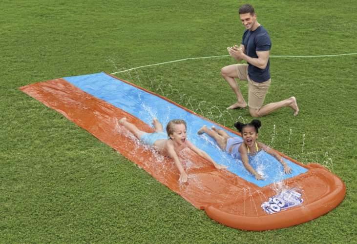 • PODWÓJNY ŚLIZG WODNY H2O GO! – zjeżdżalnia to zdecydowany ulubieniec letnich zabaw na świeżym powietrzu. Ślizgawka posiada podwójny tor o długości aż 488 cm, nawadniany poprzez podłączenie ogrodowego węża do natrysków umieszczonych w zjeżdżalni.
