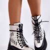 Wygodne, damskie śniegowce zostały wykonane z połączenia tkanin odpornych na mróz i wiatr oraz eko skóry. Model ten posiada klasyczne sznurowanie z przodu oraz zapinanie na zamek błyskawiczny z boku cholewki. Botki zostały osadzone na płaskim obcasie i platformie z podeszwą z bieżnikiem. Wewnątrz ocieplone miękkim futerkiem.