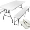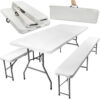 SPECYFIKACJA – Producent: Iso Trade; Marka: Gardlov; stal malowana proszkowo; kolor: jasnoszary; materiał: ławka/blat – HDPE, konstrukcja – stal, pozostałe – PVC + PE + ABS; wymiary stołu (dł/szer/wys): rozłożony (dł/szer/wys): 180x74x74cm; złożony (dł/szer/wys): 90×70,5x9cm; wymiary ławki: rozłożony (dł/szer/wys): 180x30x45cm, złożony (dł/szer/wys): 90x30x9cm; waga zestawu z opakowaniem: 30,5kg