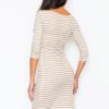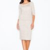 Marynarska sukienka wykonana z miękkiej, przyjemnej w noszeniu bawełny. Dodatek elastanu sprawia, że model jest elastyczny i ładnie opina ciało. Z boku wszyto niewielki zamek. Sukienka idealna na co dzień, do pracy lub na zakupy, a także na wieczorne spacery.