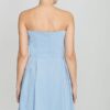 Sukienka w kobiecym, romantycznym fasonie, idealnie wpisuje się w obecne trendy. Góra gorsetowa, zmysłowo odsłania ramiona, idealnie dopasowana do figury. Sylwetka podkreślona pionowymi cięciami, z tyłu zamek. Odcinana na linii talii, dół rozkloszowany, ujęty w kontrafałdy z wydłużonym wyraźnie tyłem.