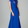 Wytworna sukienka maxi, w talii dopasowana, dołem delikatnie rozkloszowana. Pięknie podkreśli kobiecość i elegancję. Model na ramionach i w dekolcie ma ozdobne falbanki, z tyłu wiązana, a górą zapinana na guziczek.