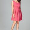 Koktajlowa sukienka bez rękawów, w pasie mała kokarda podkreślająca figurę. Model z delikatnym dekoltem, dołem kontrafałdy, zapinana na zamek. Z tyłu pięknie wyeksponowane plecy nadają wyrazistości i kobiecości.