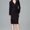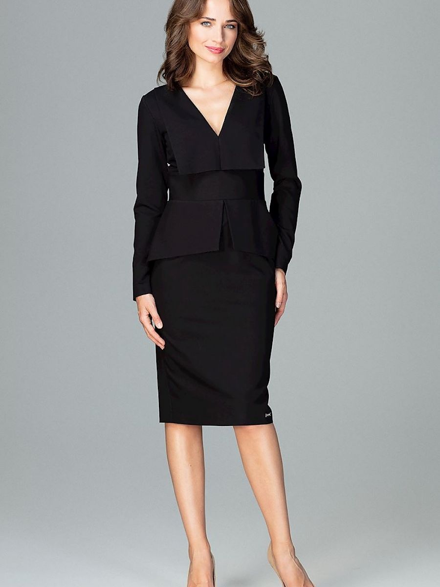 Sukienka o długości do kolana z długim rękawem, w dekolcie duże wykładane klapy. Model w pasie ma geometryczną baskinkę z tyłu rozcięcie nadające komfortu użytkowania..