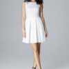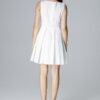 Sukienka bez rękawów. Z dopasowaną górą i kobiecym, małym dekoltem. Model odcinany na wysokości talii z rozkloszowanym, układanym w szerokie fałdy dołem. Sukienka doskonale podkreśla i wyszczupla talię.