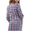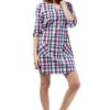 Prosta sukienka w kratkę z dekoltem w serek. Po bokach kieszenie. Z tyłu ozdobne złote guziki. Rękawy długości 3/4 z podpięciem.