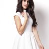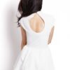 Minimalistyczny fason, sprawia, że sukienka sprawdzi się na różnego rodzaju okolicznościach w zależności od dobranych dodatków. Góra sukienki dopasowana, dół rozkloszowany uszyty z dwóch różnej długości falban. Dekolt- niska stójka. Na tyle ozdobna łezka, subtelnie odsłaniająca linię pleców.
