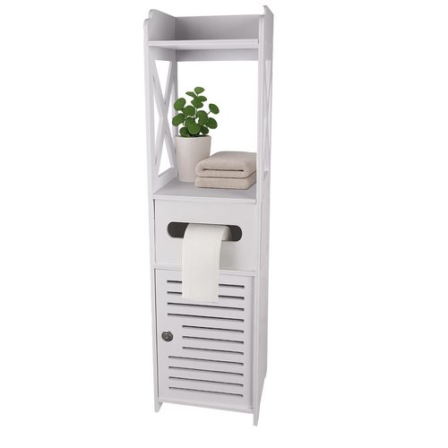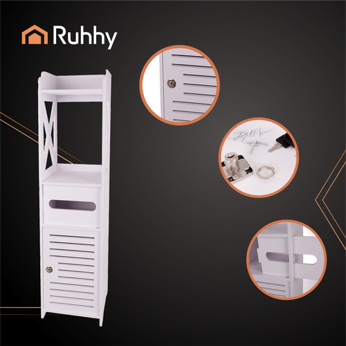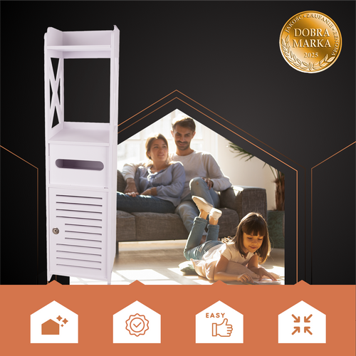 Szafka łazienkowa stojąca z uchwytem na papier toaletowy, zamykana na klucz, regał słupek w białym kolorze RUHHY!