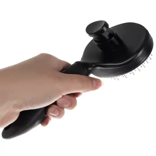 • SAMOCZYSZCZĄCA – szczotka jest samoczyszcząca, dzięki wygodnemu przyciskowi skutecznie i szybko usuwa sierść zalegającą na igłach. Jest to bardzo wygodne rozwiązanie podczas czesania zwierzęcia, ponieważ nie musisz wyciągać sierści przy czesaniu, tylko użyć wygodnego przycisku, a sierść sama podejdzie do góry.