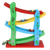 Zjeżdżalnia z autkami posiada 4 poziomy, a tym samym 4 tory wyścigowe, każdy w innym kolorze. Ustawiając samochodzik na najwyższym torze, dziecko może obserwować jak zjeżdża na sam dół. Zabawka została skonstruowana w taki sposób aby pociecha mogła wypuścić 4 pojazdy na raz, jeden po drugim. Podczas zabawy będzie podziwiać prędkość i akrobacje zjeżdżających wozów.