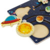 • EDUKACYJNA UKŁADANKA Z UKŁADEM SŁONECZNYM – drewniana układanka „Układ Słoneczny” to interaktywna zabawa edukacyjna, która rozwija wiedzę dziecka o planetach i przestrzeni kosmicznej. Na planszy umieszczone są ruchome, kolorowe elementy przedstawiające wszystkie planety Układu Słonecznego. Zadaniem dziecka jest przesuwanie planet w specjalnych suwnicach i dopasowanie ich do odpowiednich nazw oraz numeracji widocznej na dolnej części planszy. Każda planeta jest dokładnie ponumerowana, co dodatkowo wspomaga naukę kolejności planet w Układzie Słonecznym. To idealna zabawka, która łączy naukę z zabawą, rozwijając jednocześnie umiejętności motoryczne.