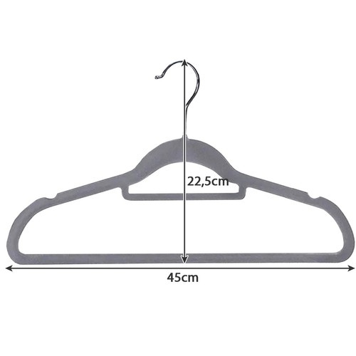 - SPECYFIKACJA – kolor: szary; materiał: konstrukcja: ABS + PET pokryta tkaniną welwet, pozostałe elementy: żelazo; wymiary: 22,5 x 45 x 0,6 cm; waga wieszaka: 77 g; waga zestawu: 1,540 kg; waga w opakowaniu: 1,715 kg.