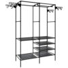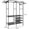 - SPECYFIKACJA – kolor: czarny; materiał: żelazo, pozostałe: włóknina + PP; ilość półek: 6; ilość drążków do wieszania: 1; ilość bocznych wieszaków 8; maksymalne obciążenie: przy równomiernym rozłożeniu 80 kg; wymiar: 173 x 36 x 108 cm; waga: 4,5 kg; waga w opakowaniu: 4,9 kg.