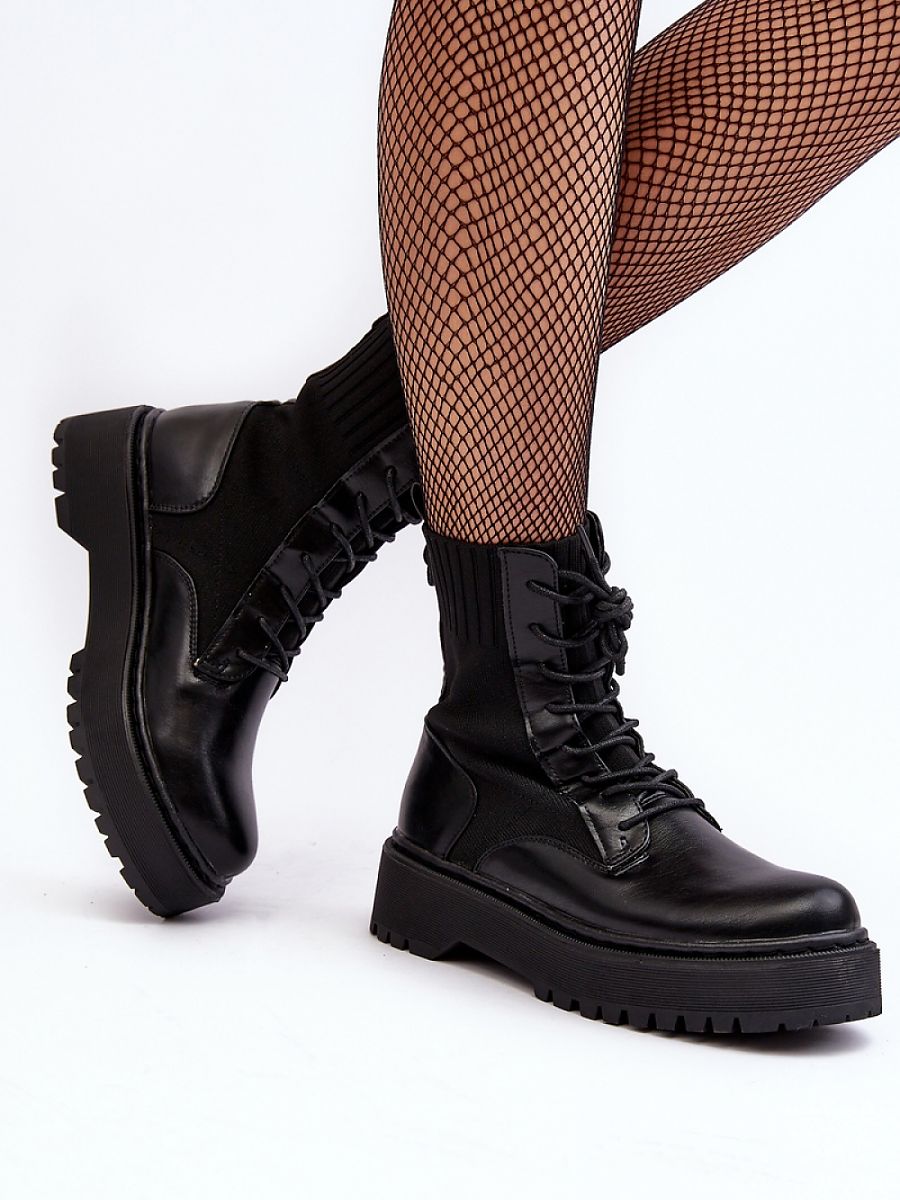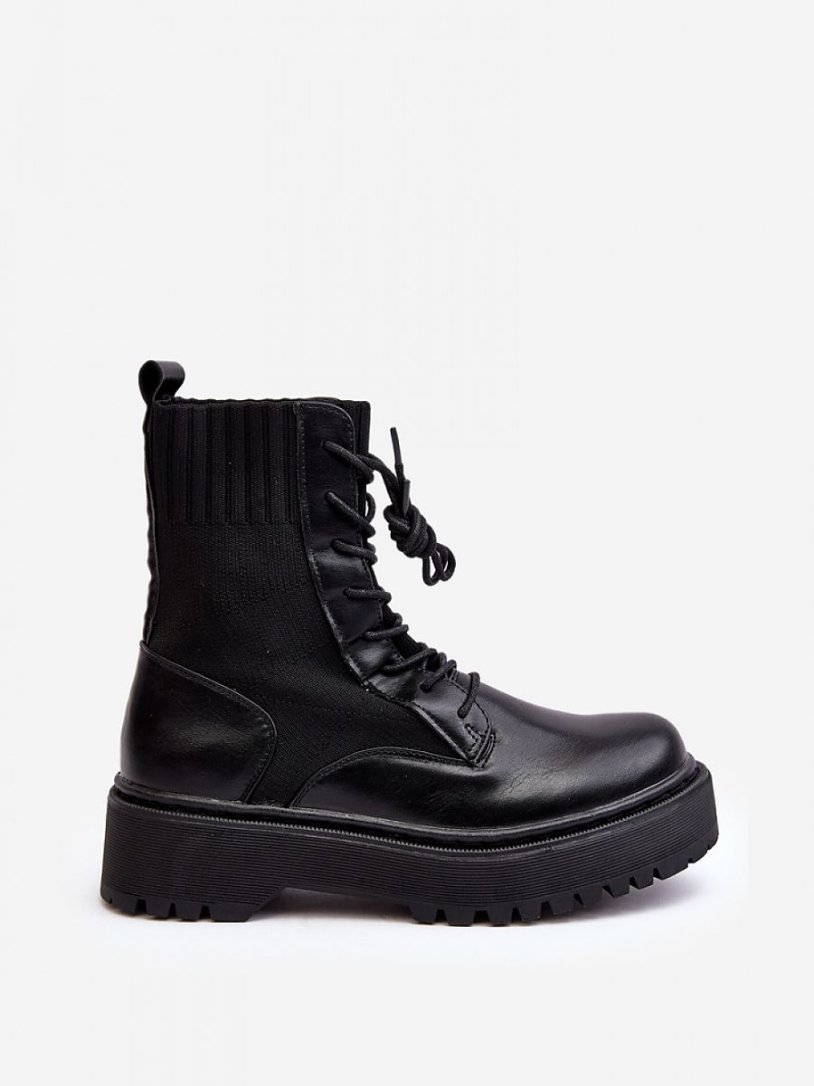 Botki damskie wykonane z połączenia eko skóry i materiału tekstylnego. Cholewka ze kostkę. Model sznurowany. Osadzone na płaskim obcasie i masywnej platformie. Noski zaokrąglone. Usztywniony zapiętek. Klasyczny model, który będzie pasować do wielu jesiennych stylizacji!
