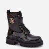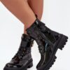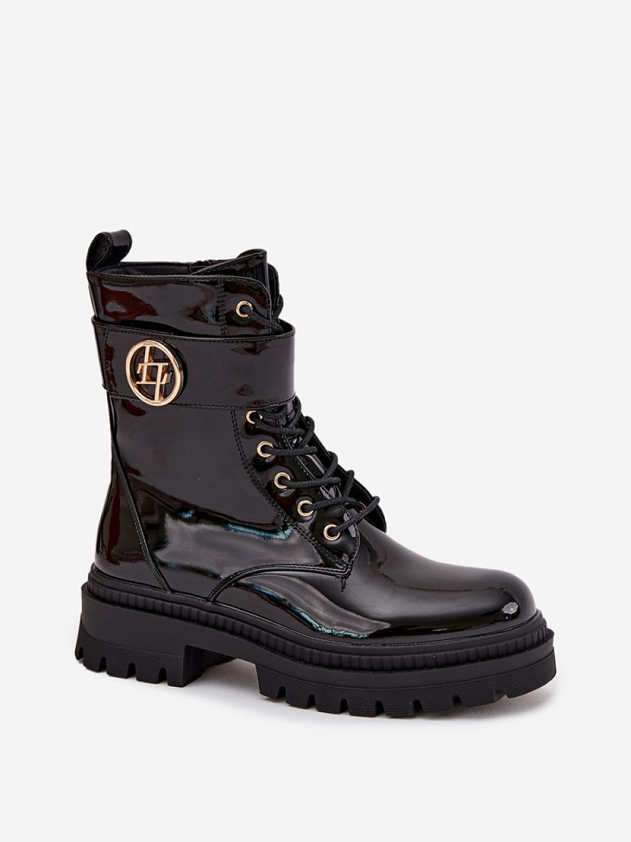 Botki damskie wykonane z eko skóry. Osadzone na platformie i płaskim obcasie, zapewniają komfort i stabilność na każdym kroku. Model zapinany na zamek i sznurowany pozwala na idealne dopasowanie do stopy. Z boku cholewki, na pasku znajduje się ozdobny złoty detal. Środek ocieplony futerkiem gwarantuje ciepło, sprawiając, że te botki będą doskonałym wyborem do zimowych stylizacji.