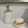 - MYDELNICZKA Z BAMBUSOWĄ WKŁADKĄ I DOZOWNIK DO MYDŁA – mydelniczka z zestawu wykonana jest z wysokiej jakości tworzywa PP, charakteryzującego się wytrzymałością i odpornością na wilgoć. Bambusowa wkładka z poprzecznymi otworami skutecznie separuje mydło od wody zbierającej się na spodzie mydelniczki, co przedłuża jego trwałość i ułatwia utrzymanie czystości. Dozownik do mydła wyróżnia się eleganckim połączeniem materiałów – białego PP oraz bambusa. Srebrny dozownik przykręcany do bambusowej podkładki tworzy stylowy kontrast, który nie tylko wygląda estetycznie, ale także dodaje funkcjonalności.