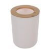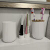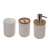 - KUBEK NA SZCZOTECZKI I KUBEK DO PŁUKANIA UST – w zestawie znajdują się dwa kubki – jeden przeznaczony do płukania ust podczas mycia zębów, a drugi do przechowywania szczoteczek do zębów. Kubek na szczoteczki jest wyposażony w bambusową nakładkę z dwoma dużymi otworami, które ułatwiają odseparowanie szczoteczek, zapobiegając ich stykaniu się. Oba kubki charakteryzują się eleganckim, białym wykończeniem z karbowaną powierzchnią, które nadają im nowoczesny wygląd.