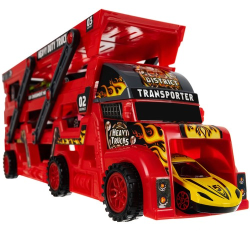 - SPECYFIKACJA – kolor: czerwony + czarny; materiał: ciężarówka (PP) + 6 aut (stop cynku); ilość autek: 6; wymiary lawety (dł/szer/wys): 30 x 11,5 x 7 cm; waga: 0,440 kg; waga w opakowaniu: 0,560 kg.