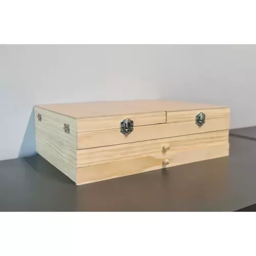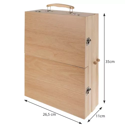 - PRAKTYCZNA WALIZKA Z 2 SZUFLADKAMI – zestaw artystyczny posiada praktyczną drewnianą walizkę, która wyposażona jest w zamknięcie i uchwyt. Dzięki temu transportowanie zawartości walizki jest komfortowe i bardzo proste.