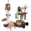 • WÓZEK TRANSPORTOWY Z ERGONOMICZNYM UCHWYTEM – wózek na czterech szerokich kołach, wykonany z wysokiej jakości tworzywa PP, został zaprojektowany tak, aby łatwo można było go przemieszczać. Ergonomiczna, szeroka rączka ułatwia dzieciom prowadzenie wózka nawet w trakcie zabawy w ruchu. Na dwóch półkach można ustawić różne elementy zestawu: wiaderko z sitkiem do odciskania mopa na dolnej półce oraz miseczkę, spryskiwacz, ściągaczkę do wody i kostkę mydła na górnej półce. Dzięki specjalnym otworom, wózek może pomieścić okrągłą miotełkę do kurzu , gąbkę oraz mopa, zapewniając łatwy dostęp do wszystkich narzędzi. Z boków wózka znajdują się dwa haczyki do zawieszenia ściereczki z mikrofibry.